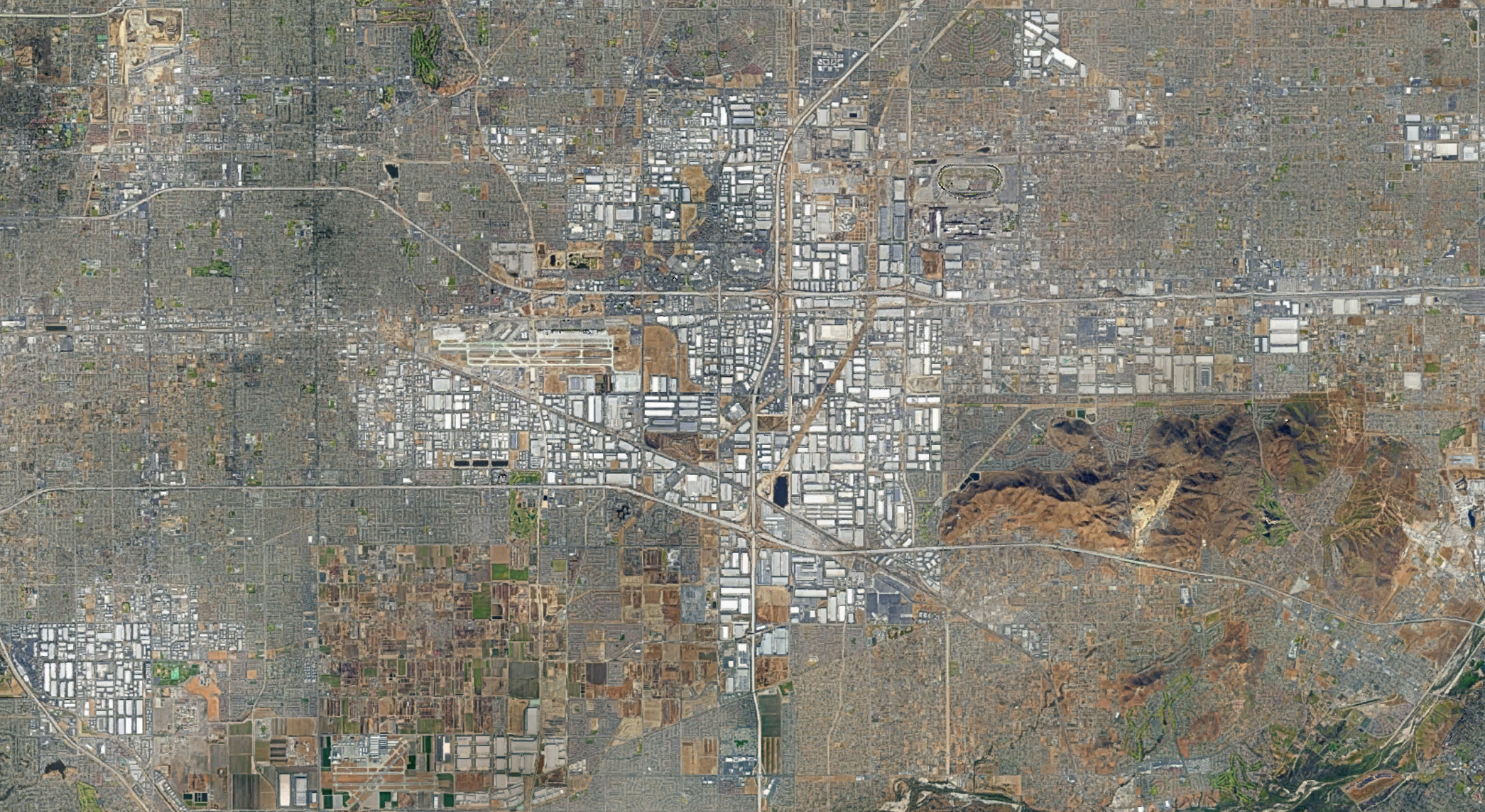 After shipping containers are unloaded at the ports of Long Beach and Los Angeles, much of the cargo makes its way 90 km northeast to California’s Inland Empire. This region, which includes San Bernardino and Riverside, is home to nearly 5 million people and roughly 4,000 warehouses. These warehouses, and their adjacent parking lots, cover about 140 square kilometers, an area larger than San Francisco. The Inland Empire has been a logistics hub since the early 2000s but “the ecommerce boom of the pandemic accelerated the land grab, and the region became ever more hardscaped.”