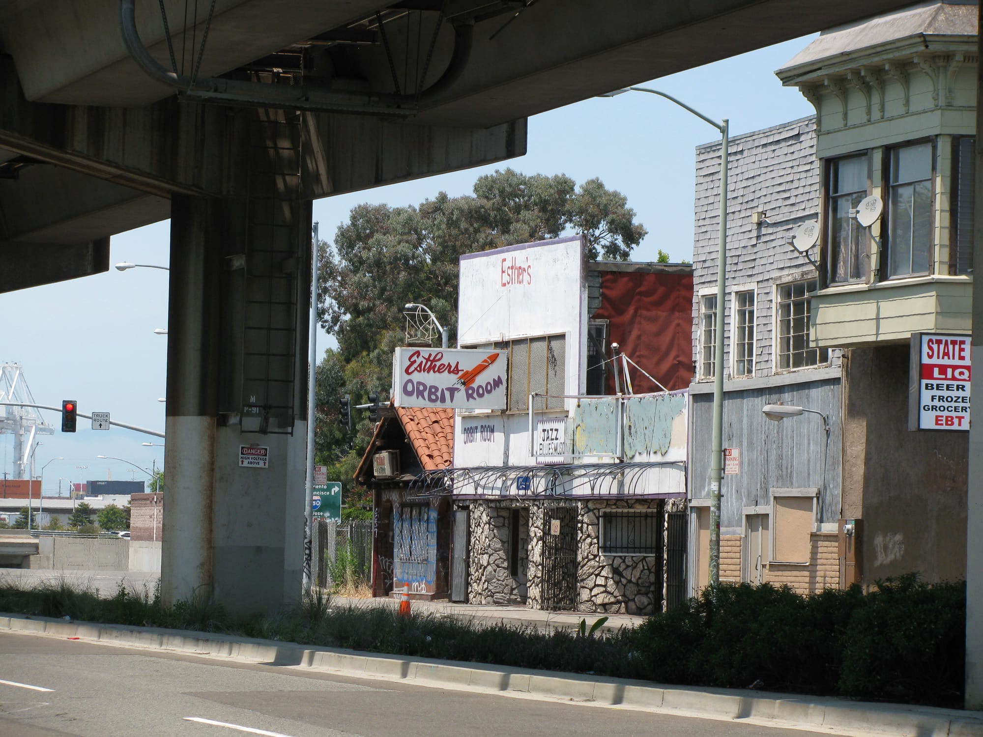 We drove on, passing between the Nutter port (a reasonably modern container port) and Cool Port (where perishable goods are transferred between refrigerated containers, trucks, and rail cars), then took 7th Street back towards West Oakland. To get there, 7th Street had been trenched underneath I-880, and as we reemerged at surface level we were shaded from our right by a massive USPS sorting facility, and from above by the elevated BART tracks. To our left, on the sunny side of the street, were old West Oakland’s storied cultural institutions: Esther’s Orbit Room, Slim Jenkins Court. These places bustled with activity in the mid-twentieth century, but were then overshadowed, redlined, and choked out by all the negative externalities brought by the port. “It’s amazing to consider what this place used to be,” Alexis said. “And now, it’s pretty empty.”
