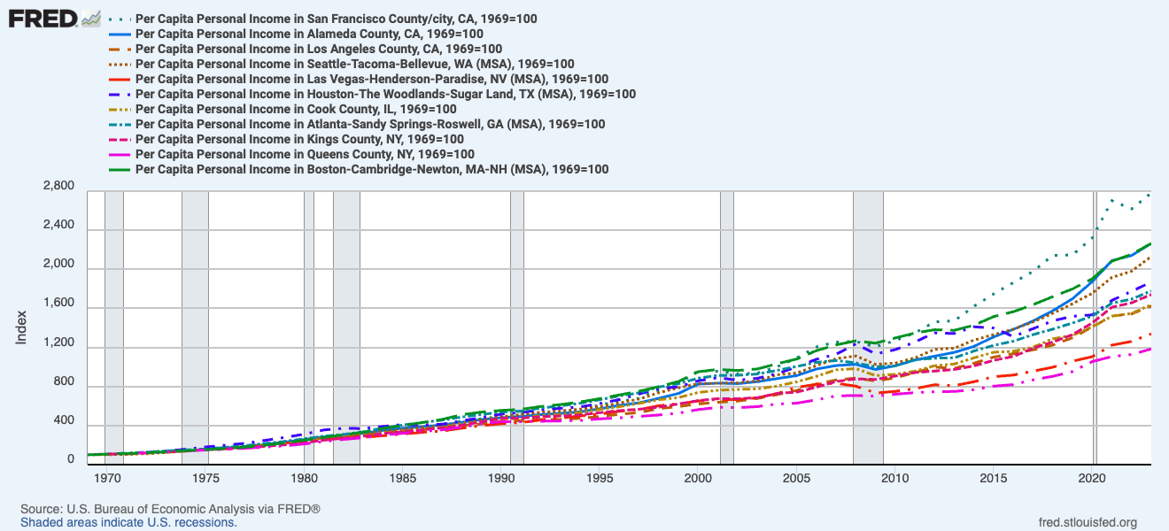 This might seem a far-out claim to make: that containerization, a method of efficiently moving goods around, eroded the cosmopolitan sensibilities that defined mid-twentieth-century working-class life in San Francisco. But I do know that as soon as I was old enough to decide where I wanted to live, I found that San Francisco wasn’t quite the place that my mom, who left the city in 1981 and died in 1996, had shown me. San Francisco’s housing price index more than doubled between the year she moved away from the city and the year she died. By the time I got to college, in 2001, it had nearly doubled again, and it doubled a third time by 2017, when my first kid was born. Since 1975, the earliest year that the St. Louis Fed has data on, San Francisco’s housing price index has increased twenty-seven fold.