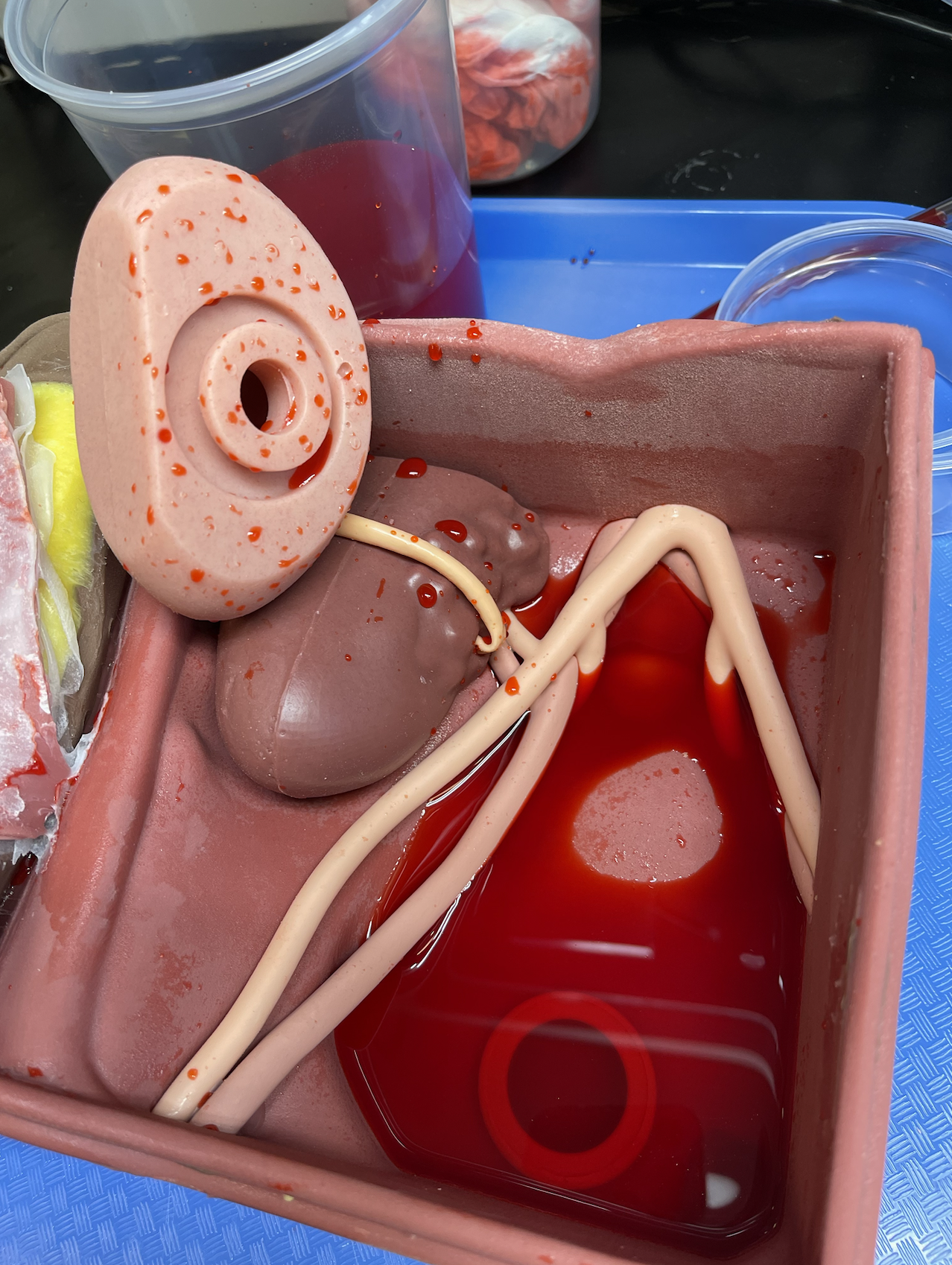 "This is a full simulation scenario trainer developed from 0 to complete in ~5 weeks. In this scenario, the clinical team is performing a revision surgery after a complication from a kidney transplant. Then bam, we turn on the surprise bleeding to simulate accidentally nicking a major vessel." Photo credit: Andrew Edman.