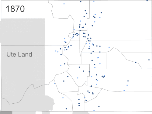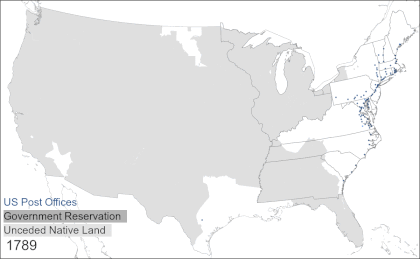 Cameron Blevins: So, it's interesting, I didn't approach this project from an interest in the US postal system and its institutional history. The origin of this project was a seminar paper looking at the historical geography in the western United States. I was trying to figure out a way to map out shifting demographics of where people were moving on a more fine-grained scale than the census, which is every 10 years, and at the county level. I hit upon the idea of using a post office as a proxy for a surrounding community. If you could figure out where and when a post office opens, you can trace out more fine-grained patterns.