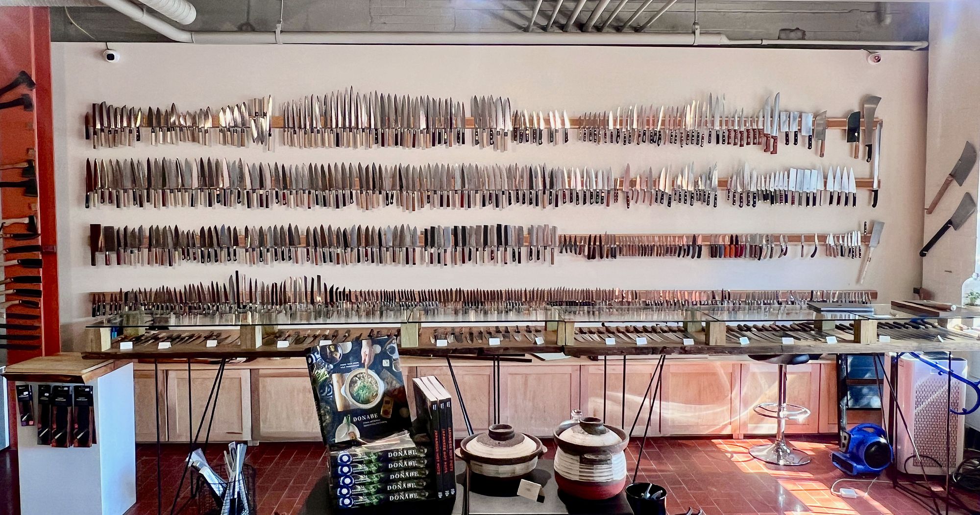 I’ve come to think this is the kind of geometry that actually matters in a kitchen knife: not the profile of the edge, but the shape of the whole. Walk into Strata and you’ll be confronted by a wall of knives, a periodic table organizing what seems like every conceivable blade, every possible combination of length, height, curvature and taper. Shape is a matchmaker. A knife with good kireaji can nonetheless feel clumsy and obstreperous if applied to the wrong task. A sharp edge doesn’t matter if the rest of the knife argues.