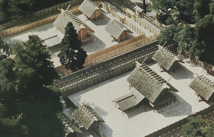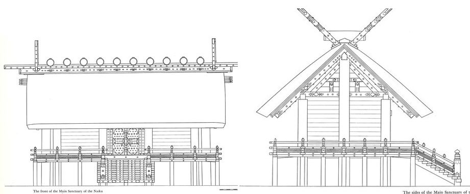 The architecture of the shrines themselves is relatively simple. They consist of large timber logs, embedded into the ground, supporting an elevated post-and-beam frame. The frame is infilled with horizontal timber planks making up the walls and floors, and an elevated veranda surrounds the entire structure. Structures at Jingu are built using hinoki, a Japanese cypress prized for its workability, its golden sheen, and its resistance to decay, and are topped with thatched roofs made of reeds. This architectural style traces its roots to grain storehouses, which were raised off the ground to prevent rice from being damaged by flood and rot.