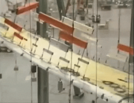 But Boeing didn’t just want to pass the test; they wanted to know when the 777’s wings would actually break. When the camera first shows this airframe, the wingtips are already way above the fuselage, bent under 130% of the design load for the wing. The airframe is a sacrificial bird, the hangar is an altar.