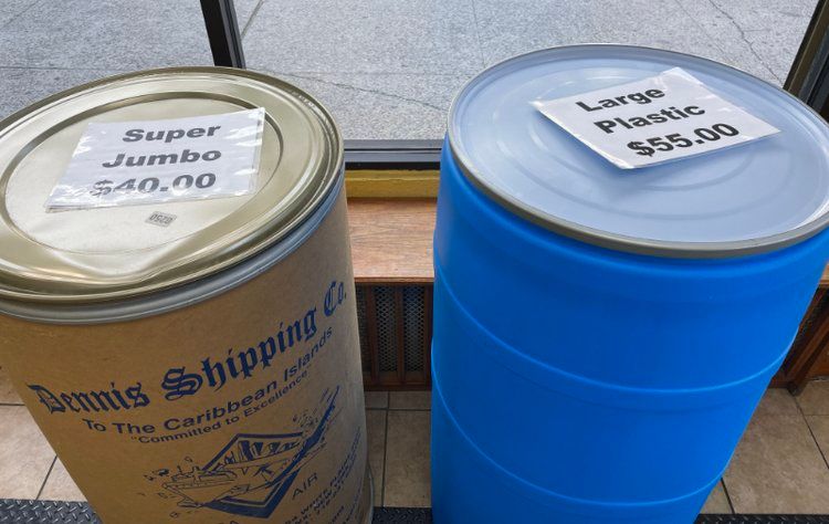 As for the specifics of purchasing, packing, and mailing barrels to the Caribbean, the process starts off fairly straightforward. The first step is to obtain your barrel. Take a walk through any one of New York’s Caribbean enclaves—like Brooklyn’s Crown Heights, Flatbush, and Bedford-Stuyvesant neighborhoods, for example— and you’ll likely encounter several shops, supermarkets, and local discount department stores selling barrel drums in 55- and 75-gallon sizes. Prices run the gamut, but can be as low as $30 for a single-use cardboard drum or as much as $100 for the larger blue plastic barrel. Holiday seasons can yield higher purchasing and shipping prices.