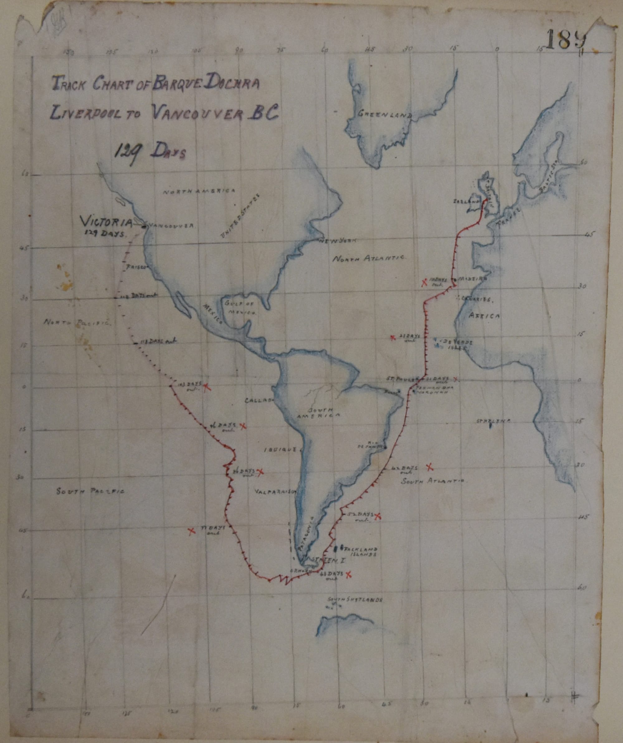 I’m deep into research for my upcoming trip to Panama, so I was delighted to find evidence of how the Panama Canal would have impacted my ancestors’ lives. This hand-drawn map from 1894 shows the route from Liverpool to Victoria, sailing past Cape Horn. The trip came in at 129 days, or just over four months spent sitting on a boat. Twenty years later, the canal would shave thousands of kilometers off the voyage. In 1928, my globe-trotting great-great-grandmother did make it to the canal as a tourist.
