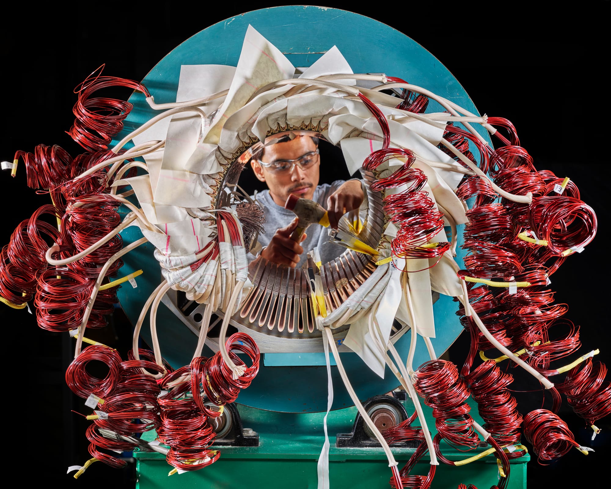 Aspects of Payne’s work might be categorized as genre art. He captures moments in everyday time; he captures human intention and effort; he captures the infrastructure required to make stuff. His subjects are often highly engineered (he has photographed ASML’s EUV machines, Boeing’s 787 assembly line, and NASA’s Space Launch System), but just as often they’re highly soulful (Payne published a book about Steinway pianos; he has also photographed Martin’s guitar factory and Zildjian’s cymbal production process). Regardless of what he’s shooting, Payne’s photographs often feel just as carefully assembled as the objects in them. One of the more notable aspects of Payne’s photography is the way he seems to lift a subject out of its surroundings. Seen through Payne’s eyes, a motor being built is only surrounded by a factory part of the time; other times, it exists in a field of pure black.