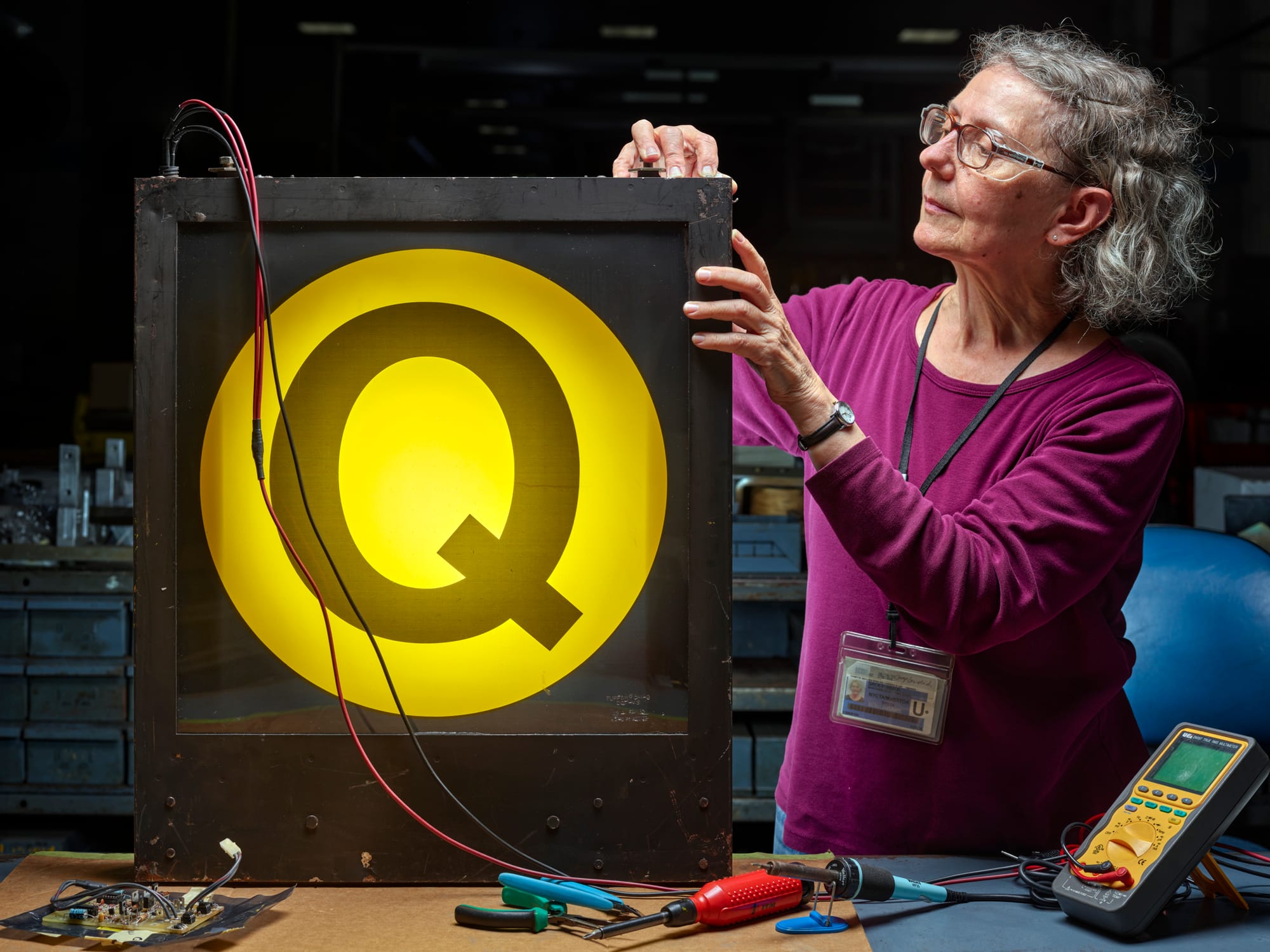 We’re at the MTA’s 207th Street repair shop, which Payne has, for some time, been photographing for the New York Times. Payne says he wants to wrap up the shoot and publish the photos; the MTA has experienced some turnover since the project began; they want to meet with Payne (and writer David Waldstein) and get a better understanding of what his goals are. While we’re here, Payne wants to see Gay’s workstation again. I’m not totally sure what Payne sees in Gay’s workstation — he keeps talking about her look — but this is what I see: