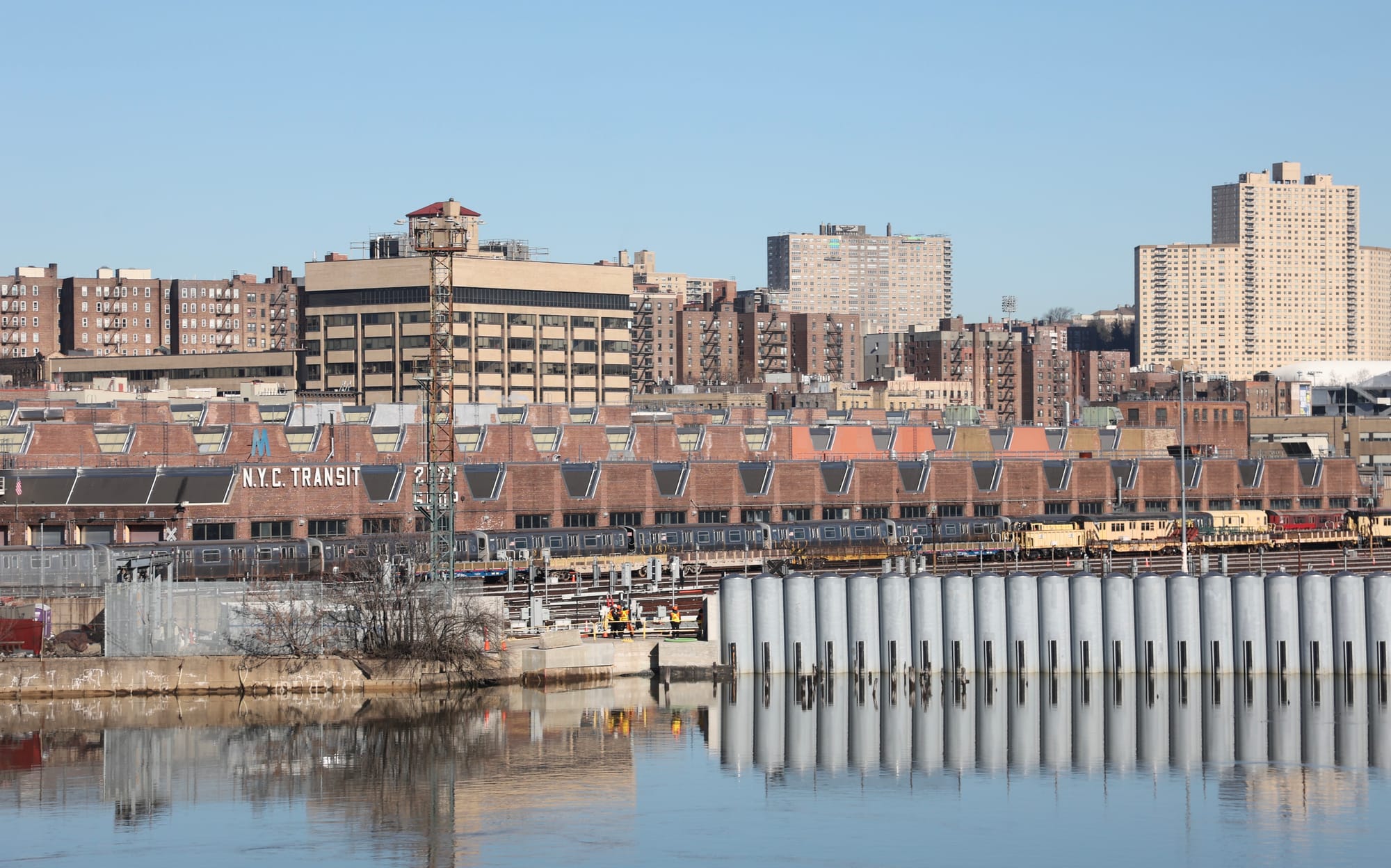 One advantage of not holding firm to a professional title is that I sometimes find myself cosplaying in a trade that I barely understand. The 4 train ends in the Bronx; I got off at Fordham Road and then walked across the University Heights Bridge in the hopes of catching a glimpse of the 207th Street shop from across the river. It turned out that I could get a view, and so I grabbed my camera, hopped the barricade separating the bridge’s pedestrian walkway from the roadway, and strolled nonchalantly from one side of the bridge to the other, wedging myself into the space between the roadway and the bridge’s seafoam-painted truss members, keeping one eye on the traffic over my right shoulder while I took a couple of pictures of the sprawling complex, framed by nothing in particular and looking drab, cluttered, and unremarkable.