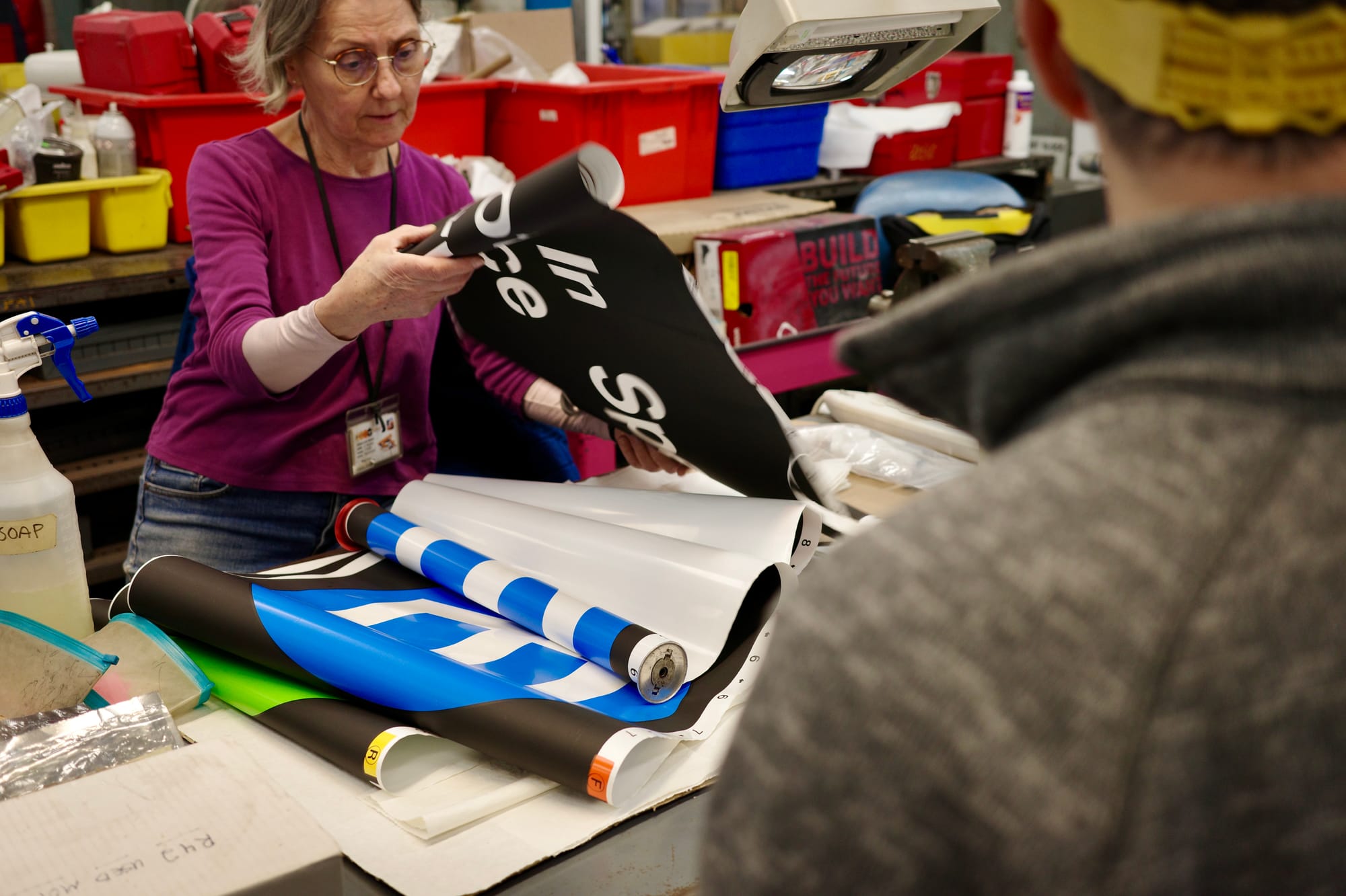 But whatever tension I was feeling, it did not seem to attach itself to Payne. Where I had heard confrontation — What is your goal here? — he seemed to hear a narrow, technical question. “The only reason we haven’t published yet is that I keep thinking of new things to photograph,” he said casually, then pointed across the table at the shop’s supervisor and chuckled. “Plus, I like bothering him every year.” At this, Payne pulled his phone out and showed everyone a picture of Gay at her workstation, and again I imagined him looking at a messy scene and finding something interesting to shine a spotlight on. The room condensed, necks craning in to catch a glimpse of whatever it was that Payne was gesturing towards, and all of the sudden we all knew what the goal was. Oh, sure, Gay. She’s here today, let’s go talk to her.