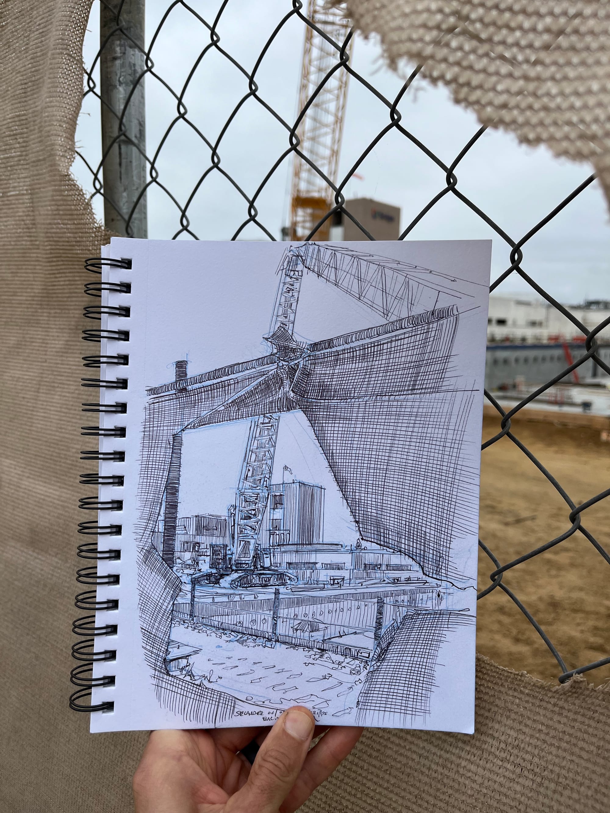 Sketching allows an umarell to quiet their thoughts and simply observe. A sketch can be intimate without straying into judgement, and it demands of the sketchmaker that they consider their vantage point carefully. Mark Selander's entry accomplished this excellently, showing both the construction site and the place from which it could be seen: